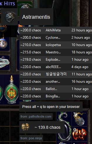- alt + D price information from poe.ninja, poeprices.info and pathofexile.com/trade